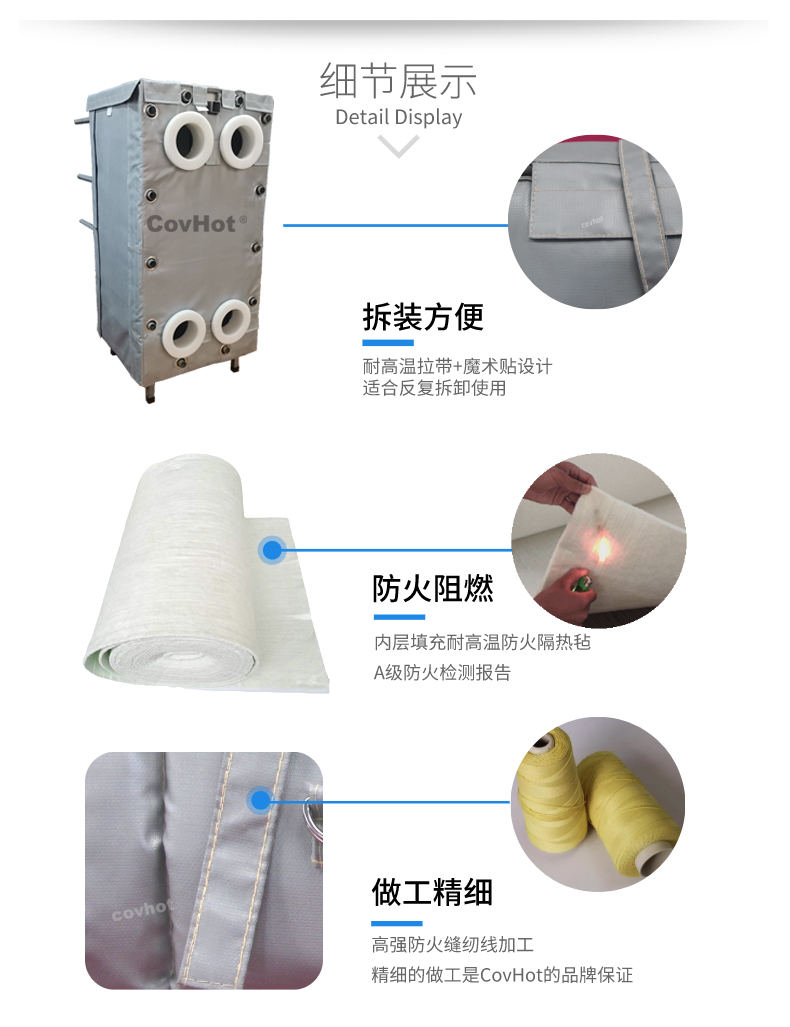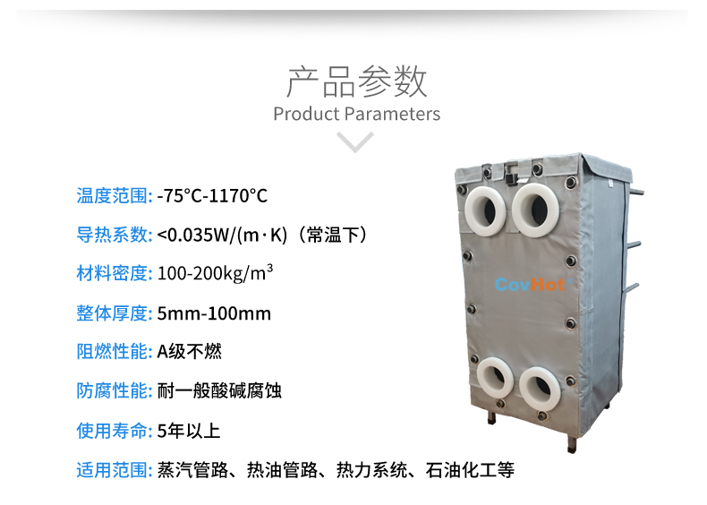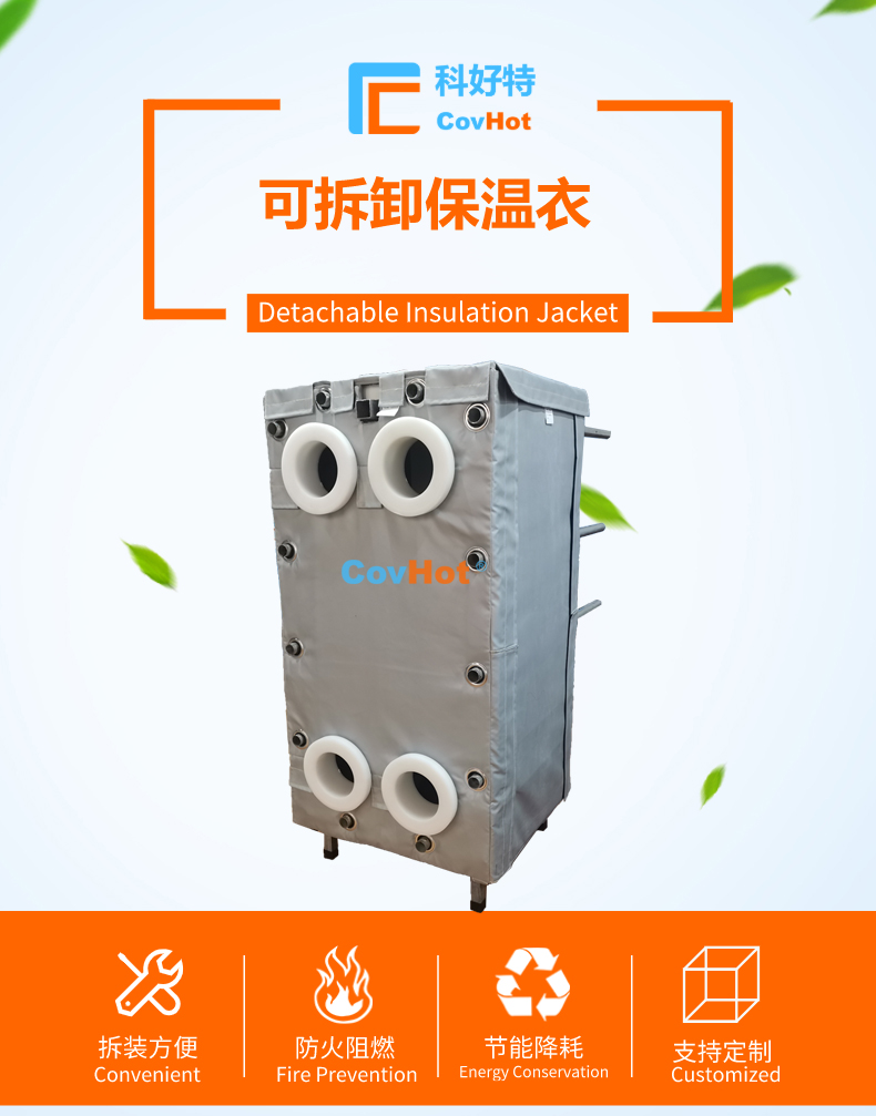 針對以上的問題,河北科好特科技有限責任公司自主研發的節能型板換保溫衣,可以有效減少換熱器的熱量損耗,而且在施工過程中安裝拆卸方便,節省人工,可拆卸保溫衣還可重復使用,起到節能降耗的效果??坪锰?a href=http://m.renren8.cn/e/tags/?tagname=%E5%8F%AF%E6%8B%86%E5%8D%B8%E4%BF%9D%E6%B8%A9%E8%A1%A3 target=_blank class=infotextkey>可拆卸保溫衣根據設備不同的尺寸形狀量身定制,可廣泛用于換熱器、閥門、管道及其它需要保溫或防凍的領域。